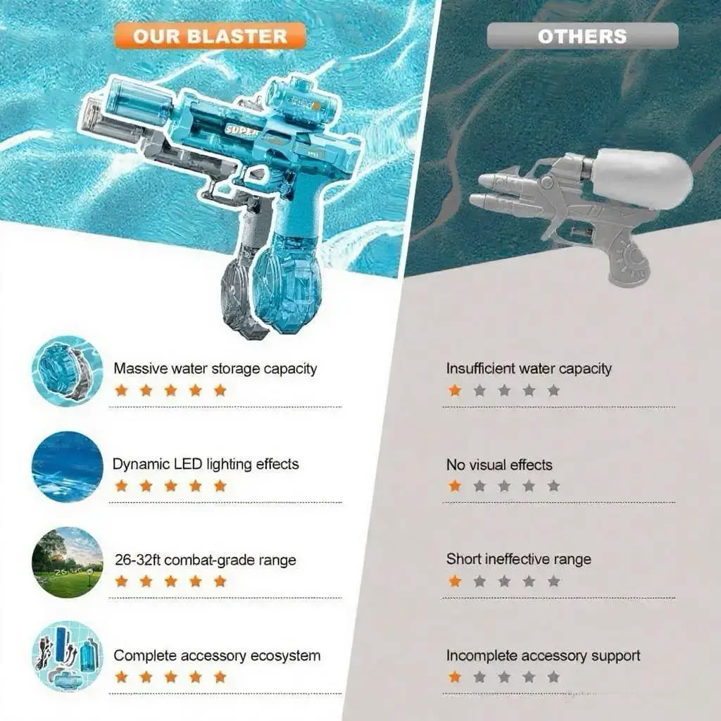 • JARAK JAUH: Memberikan jarak tembakan yang mengagumkan untuk keseronokan maksimum semasa pertempuran air, sesuai untuk aktiviti kolam renang dan luar